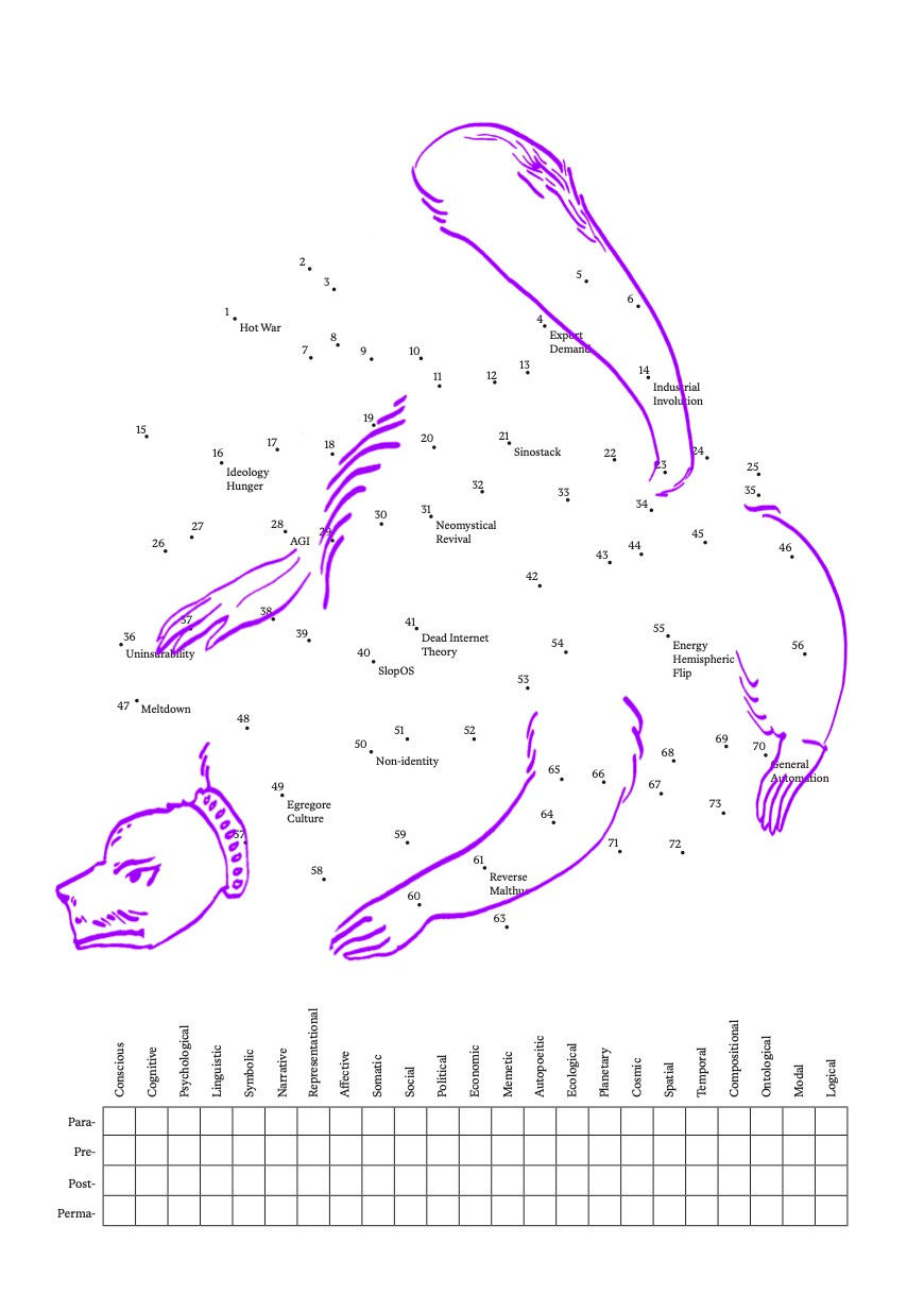 Temporal imagination shifted in the West, too. The deep, reactionary turn that took place in the long wake of the financial crisis was accompanied by various shades of ideological hunger, from wellness cultures to AI takeover to insurgent white supremacy. Cheap money from zero interest rate policies saw a gold rush for tech start-ups and an arms race for human attention. An oligarchy built on adverts and doomscrolling now turns its sights on military hard power. In the cultural sphere, mysticism, ecopoetics, non-Western perspectives, anti-technocracy, and even technocracy itself were mined as dwindling sources of available radicalism, attempts to eke out a pathway to dis-identification and exit from a permeating darkness. Anywhere but here, now, us. By the time of the Gaza genocide, Aimé Césaire’s imperial boomerang was in full backswing, as governments from the U.S. to the U.K. and Europe turned carceral state violence on their own citizens. As journalist Vincent Bevins observes in his book If We Burn, a historically unprecedented scale of revolt took place around the world since the 2010s, and resulted in scant progressive change. Protest itself had become a theatre of democracy without agency—and even this was being criminalised.